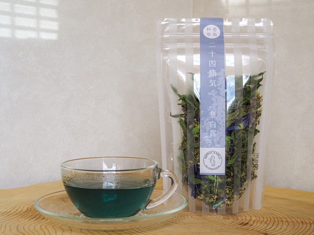 自家栽培のハーブと長野県の和草をブレンドした、四季を感じるハーブティー。 その季節にとれる和草を、丁寧に乾燥させ自然の色味と形を閉じ込めました。 ハーブを見て、触って、季節の音を聴きながら、お茶からたつ香りと味を楽しむ、、 五感で味わうハーブティーです。 白露 : 「季節の移ろい、物思いにふけるお供に。」 白露は、草花に白い朝露がつく頃。 秋になって夜が冷え込み、翌朝草に結ぶ露が白く見える情景を表しています。 ブレンド: ヤロー、ラベンダー、リコラミント、バタフライピー、レモンバーベナ、もろこしのひげ 内容量:10g(約5杯分) 保存方法:直射日光、高温多湿を避け、冷暗所にて保存 【和香草茶のおいしい淹れ方】 1.カップ1杯(約200㏄)に対して2~3gをポットへ入れます。 2.沸騰したお湯を注ぎ3分ほど蒸らします。 *植物が開いていくところをお楽しみください! 3.カップへ注いでお召し上がりください。 *蒸らし時間で味の濃さが変わります。 【注意事項】 妊娠中・授乳中の方や、お薬を服用中の方は、お医者様にご相談ください。 *保存料、着色料不使用 無農薬栽培